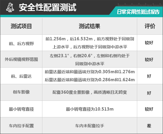 在车辆前、后方视野测试中,车内所有座椅均已调整至最低状态,所测出的数据与驾驶者正常使用时均有一些偏差,仅供参考。