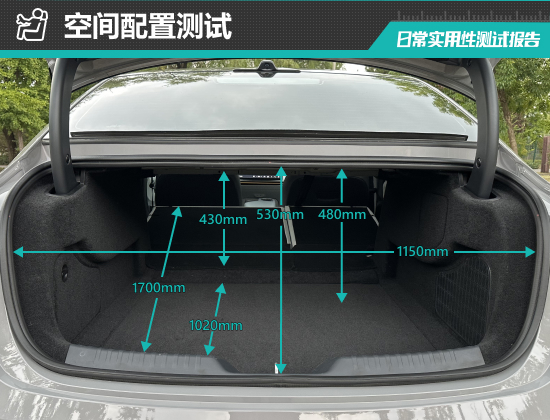 对于后备厢的基础数值,我们也进行了实测,开口长度为530mm;开口宽度为1150mm;后备厢进深为1020-1700mm;垂直高度为480mm。