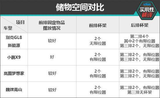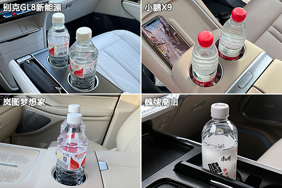 杯架测试中,别克GL8新能源车内共配备8个杯架,表现最好,小鹏X9和岚图梦想家均为6个杯架。这三款车型的共同点在于,第三排杯架都没有配备限位器。比较特殊的是魏牌高山,其第三排并未配备杯架,仅设计有储物槽,实用性表现较差。