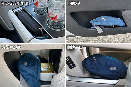 车内储物空间方面,小鹏X9整体表现最为出色,所有测试物品都能找到合适的位置摆放,专属眼镜盒内部辅以植绒材质,细节处理到位。虽然别克GL8新能源没有配备专属眼镜盒,但是位于前排杯架左侧的储物格正好可以将墨镜放置进去,拿取也还算方便。相比之下,另外两款车型都没有合适墨镜放置的位置。