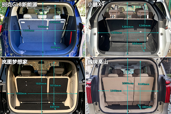 后备厢空间方面,四款车型的后备厢地板都比较平整,且第三排座椅均支持放倒,能够进一步拓展使用空间。从测试数值来看,整体表现最好的是小鹏X9,有3项测试成绩优于同级别测试均值;别克GL8新能源和魏牌高山次之,各有2项测试成绩优于同级别测试均值;表现最差的是岚图梦想家,仅有1项测试成绩优于同级别测试均值。