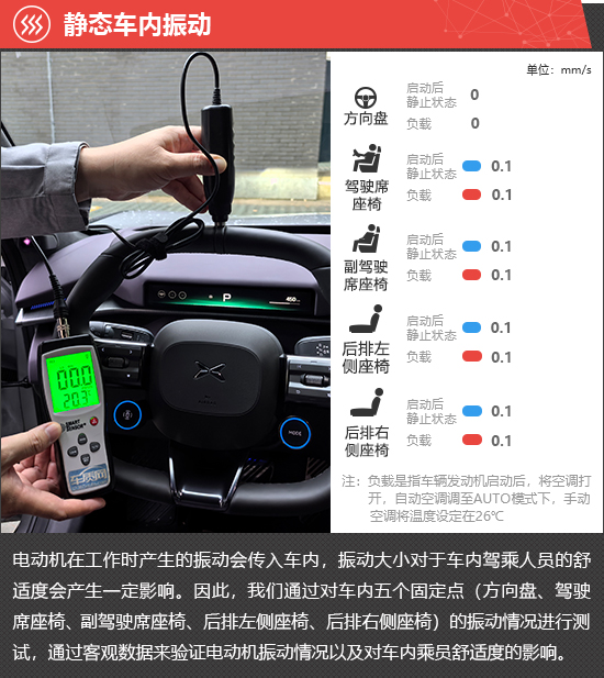 在静态车内振动测试环节,启动后静止和负载两种状态下,2025款小鹏P7方向盘位置的振动数值始终为0,前后排座椅的振动数值均为0.1mm/s,体感轻微。