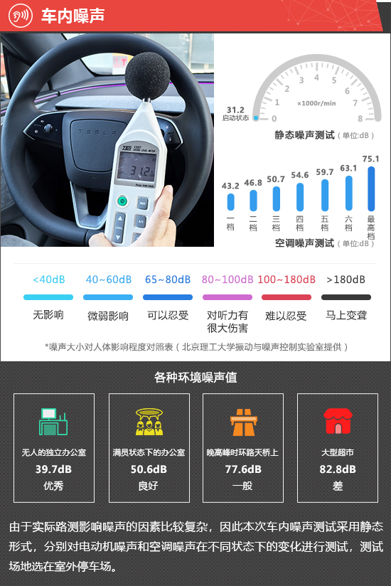 在静态噪声测试环节,2025款特斯拉Model Y L在启动状态下车内实测噪声值为31.2dB,在测试过的同级别车型中处于中上游水平。