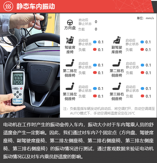 在静态车内振动测试环节,启动后静止和负载两种状态下,2025款特斯拉Model Y L方向盘位置的振动数值始终为0,三排座椅的振动数值均为0.1mm/s且保持不变,实际体感轻微。