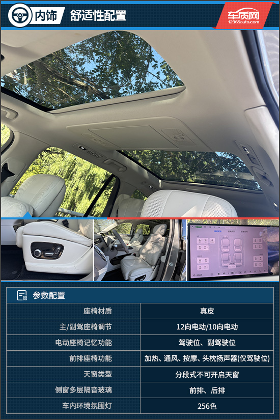 舒适配置方面,评测车配备分段式不可开启天窗,并提供物理遮阳帘,可有效防止阳光直射。前排11层云感座椅宽大柔软,副驾配有电动腿托,可充分支撑腿部,并具备加热、通风、按摩等多项功能,舒适性表现出色。值得一提的是,其还配备支持整圈加热的方向盘,在冬季驾车时尤为贴心。