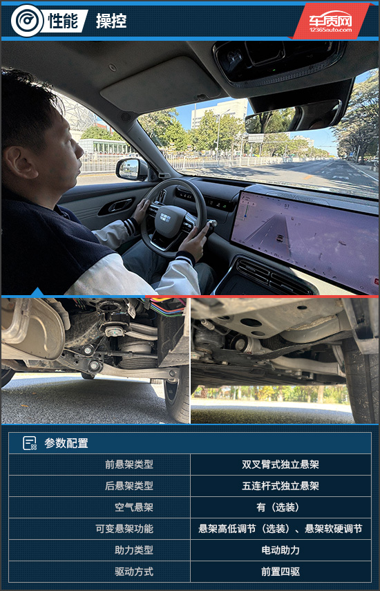 动力虽强,但评测车的驾驶感受却仍以居家为主。其转向手感轻盈且精准,低速行驶时易于掌控,高速状态下则稳重从容;配合华尔兹式掉头与敏捷转向功能,即便在极为狭窄的场景下也能轻松应对,丝毫不显笨重。此外,评测车还选装了双腔闭式空气悬架,搭配CCD连续可变阻尼减振器,整车动态表现十分均衡,既能在高速过弯时保持车身稳定,又能有效过滤细碎颠簸,可带来出色的行驶舒适性。