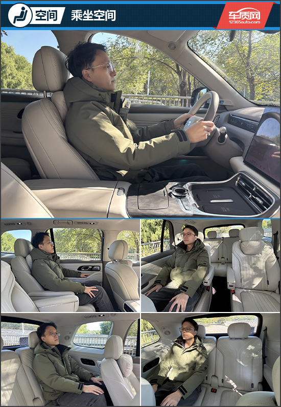 评测车采用2+2+2形式的三排6座布局,身高181cm的体验者在前排就座后,头部及横向空间表现出色。第二排为独立座椅,宽大舒适,配备独立扶手,支持多向调节,调至最靠后位置时,空间感与舒适性均达上乘水准。