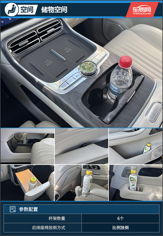 在储物空间方面,评测车表现十分出色。中控台前方配备带盖板的杯架,下方设有大尺寸开放式储物格,并提供两个USB Type-C电源接口,实用性极强。第二排配备小桌板与智能冰箱,座椅扶手内还隐藏有杯架;第三排同样设置了杯架,细节考量十分周到。此外,车门把手采用封底式设计,进一步提升了储物灵活性。
