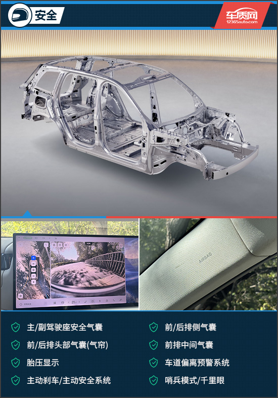 安全配置方面,评测车搭载了丰富的主/被动安全配置。诸如主/副驾驶座安全气囊、前排中间气囊、车道偏离预警系统、哨兵模式/千里眼等在评测车上均有配备,可以有效提升行车安全性。此外,其采用高强度星甲笼式车身,最高材料强度达到2000MPa,在碰撞过程中可最大程度保证乘员安全。
