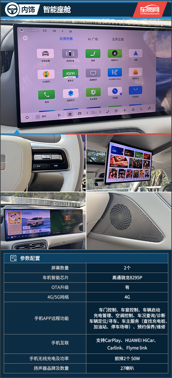 评测车搭载了Flyme Auto 2新一代AI智能座舱,车机画面显示清晰细腻,内置高通骁龙8295P芯片,系统运行流畅,操作体验自然顺滑。座舱还支持全场景AI Agent,可实现用车、出行、娱乐等多维交互,带来多元化的智能体验。同时,其在后排还配备了17.3英寸吸顶屏,乘客在长途出行时也不会感到无聊。音响系统方面,评测车搭载27个扬声器的Flyme Sound无界之声系统,并配备可插拔式头枕音响,营造出沉浸式的听觉氛围。