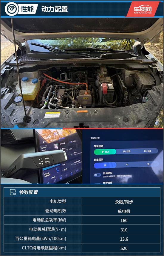 评测车使用东风马赫动力,前置单电机总功率160kW,总扭矩310N·m,匹配单速固定齿比变速箱。磷酸铁锂电池组的容量为62.36kWh,CLTC纯电续航为520km。对于一款家用车来说,属于主流水平。
