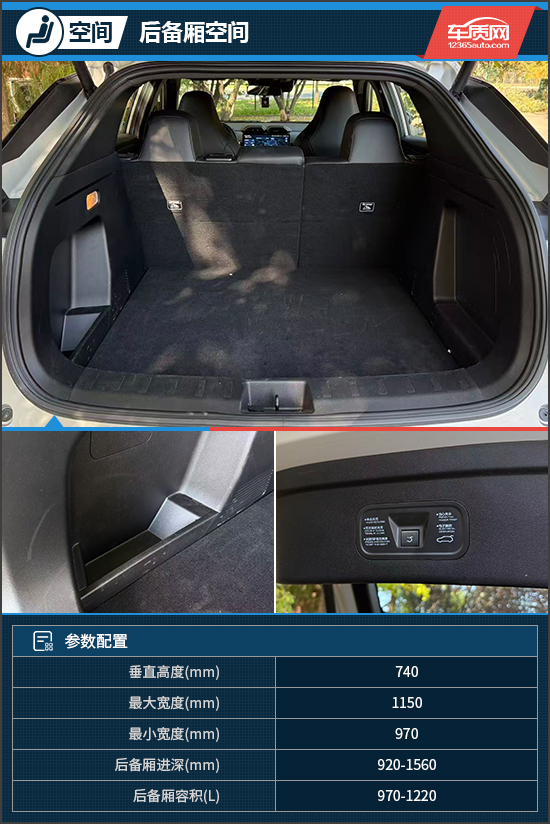 后备厢内部较为规整,两侧进行了掏空处理,左侧配备了一个深度和容积都不错的储物槽,便于放置易于晃动的物品。同时,评测车还标配了电动尾门,支持延迟关闭和高度记忆,很人性化。