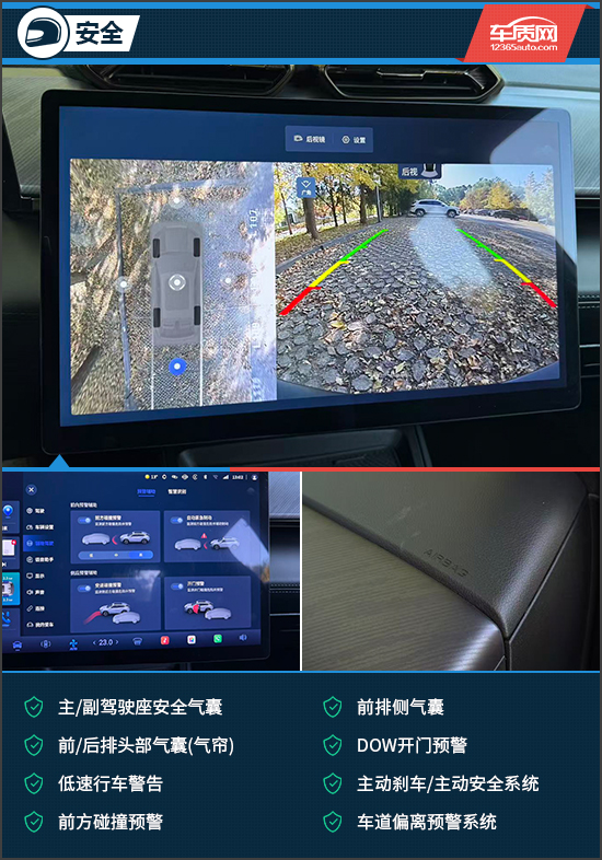 安全配置方面,此次的评测车配备了较为齐全的主/被动安全功能,包含前方碰撞预警、车道偏离预警系统、DOW开门预警以及低速行车警告等,并且均为标配,十分厚道。