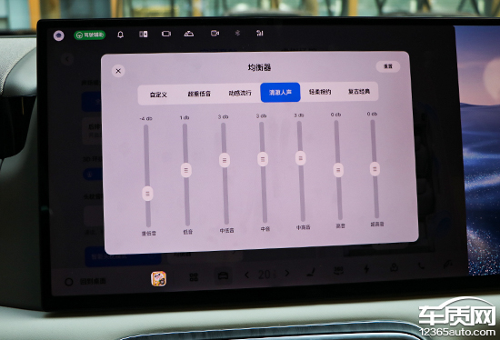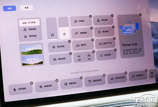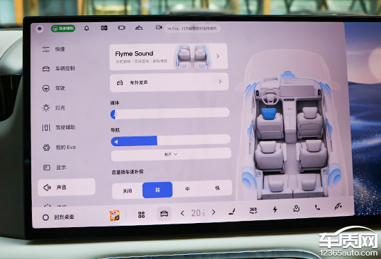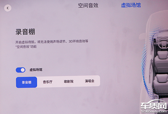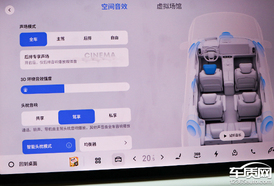 评测车配备Flyme Sound无界之声音响系统,基于27个扬声器打造出9.1.6声道AI全景声,最大功率达到2300W。软件方面,这套音响系统的设置内容相当丰富,分为空间音效和虚拟场馆两大模块。前者包括声场模式、3D环绕音效强度、头枕音响以及均衡器调节。后者是特色功能,提供录音棚、音乐厅、歌剧院和演唱会四种模式。