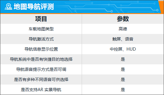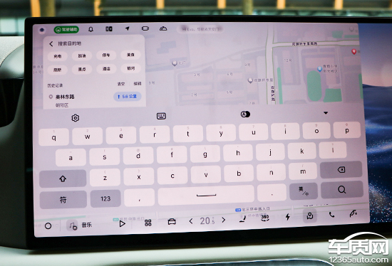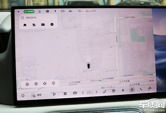 评测车内置高德地图,常规界面布局简单易上手,搜索栏位于左上角,支持多种输入方式。快捷目的地选择包括家、公司以及收藏夹等,能够满足日常使用所需。打开搜索栏,系统还会显示一些预设的场景选择,例如充电、加油、停车以及美食等。