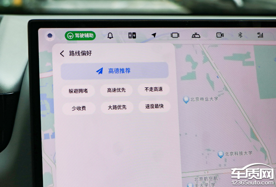 确认目的地后,系统会提供多条路线选择。基本信息显示比较丰富,包括行程用时、里程以及红绿灯数量。基于车联网,地图界面还可以显示路线的拥堵情况,为驾驶员提供参考。此外,用户还可以根据喜好进行路线偏好的设置,例如躲避拥堵、高速优先以及少收费等。