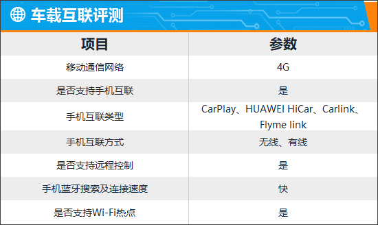 车载互联部分,评测车配备4G网络,支持车联网、OTA升级、Wi-Fi热点以及手机APP远程功能。实测蓝牙的搜索及连接速度都比较快,日常使用体验很好。手机互联方面,系统支持CarPlay、HUAWEI HiCar、Carlink、Flyme link,除此之外,投屏助手内还提供无线和有线投屏。