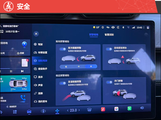 评测车支持L2级辅助驾驶,具备并线辅助、车道保持辅助系统等功能。实测过程中,其能够较为舒适地完成跟车加减速等动作,同时也能较为稳定地保持在车道线内,在特定路况下可有效缓解驾驶疲劳。