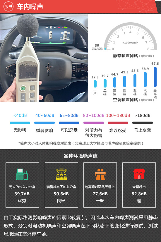 在静态噪声测试环节,评测车在启动状态下车内实测噪声值为30dB,在测试过的同级别车型中处于上游水平。