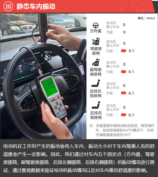 在静态车内振动测试环节,启动后静止状态下,评测车所有位置的振动数值始终为0,负载状态下所有座椅的振动数值升至0.1mm/s,体感不明显。