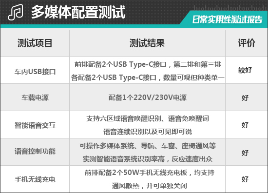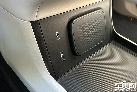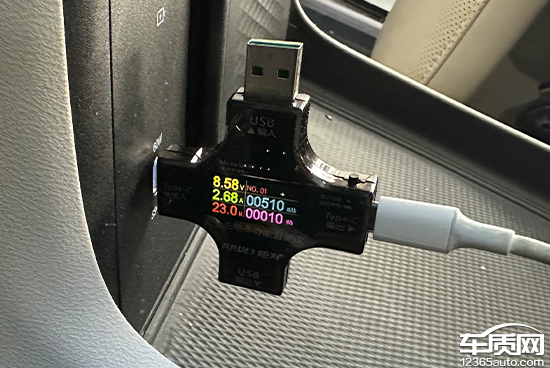 在车内USB接口方面,评测车前排配有2个USB Type-C接口,第二排和第三排各配有2个USB Type-C接口,数量可观但种类单一。同时,车内还配备1个220V/230V电源。此外,我们对USB接口进行了测试,前排Type-C接口的测试成绩在8.58V、2.68A、23W左右;第二排Type-C接口的测试成绩均在9.2V、1.46A、13.4W左右;第三排Type-C接口的测试成绩均在9.09V、1.45A、13.2W左右。