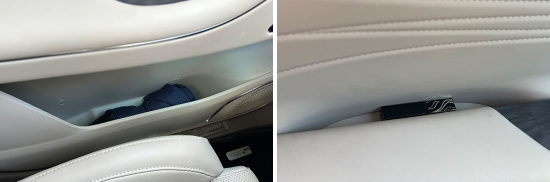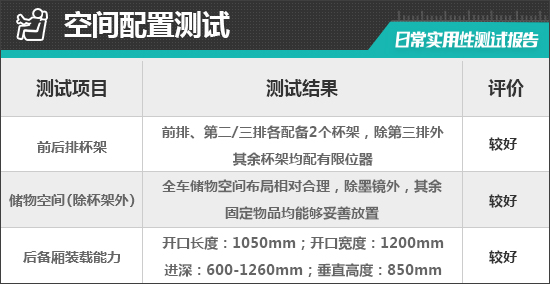 对于车内使用空间的测试,只针对前排触手可及的空间,不包括手套箱、中央扶手箱等需开启的空间。测试方法是将以下固定物品全部放置在前排的各个储物空间内,通过固定物品的放置情况来判断车辆储物空间的表现。测试选定的固定物品为:2瓶常规大小的矿泉水、1部大屏手机、1支口红、1个挎包、1副墨镜、1把折叠雨伞以及1包常规尺寸的抽纸。