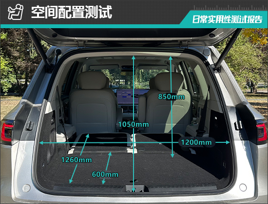对于后备厢的基础数值,我们也进行了实测,开口长度为1050mm;开口宽度为1200mm;后备厢进深为600-1260mm;垂直高度为850mm。