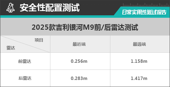 前驻车雷达最远可在1.158m处感应到前方物体,雷达功率表现可圈可点,最近端提示距离为0.256m,表现与同级别车型测试均值基本一致。