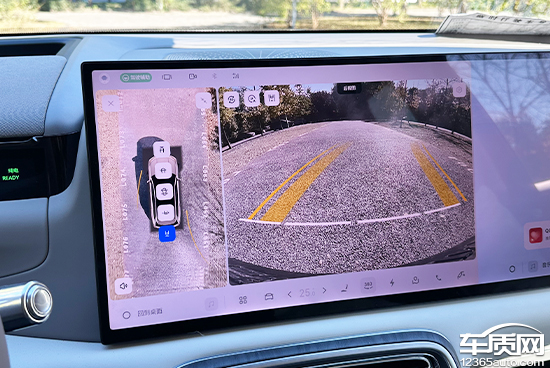 评测车配备了360度全景影像,可以多角度查看,方便驾驶员了解车辆周边情况。经实测,整体画质清晰且无畸变,并配有可随动转向的倒车辅助线,能够减轻泊车时的压力。