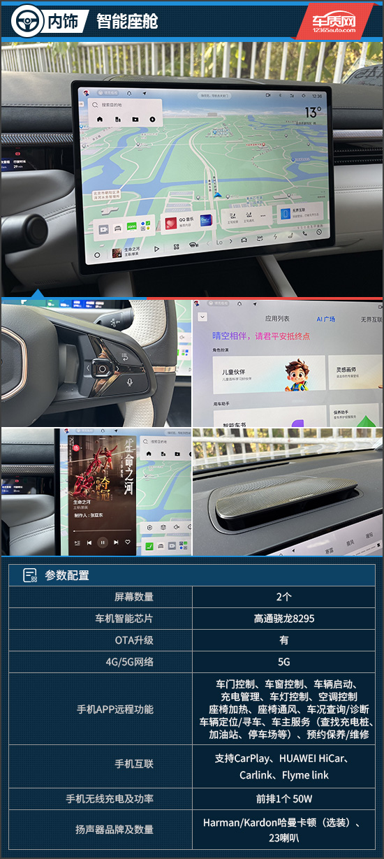 评测车搭载Flyme Auto 2新一代AI智能座舱,车机屏幕显示细腻清晰。系统内置高通骁龙8295芯片,运行流畅,并支持多任务小窗模式,操作更加高效。Flyme AI大模型可实现场景助手、AI导游等多维交互,带来更具温度的智能体验。值得一提的是,仪表台中部的Harman/Kardon哈曼卡顿音响创新采用一体式升降设计,可与出风口实现智能联动启闭,兼顾仪式感与听觉享受。