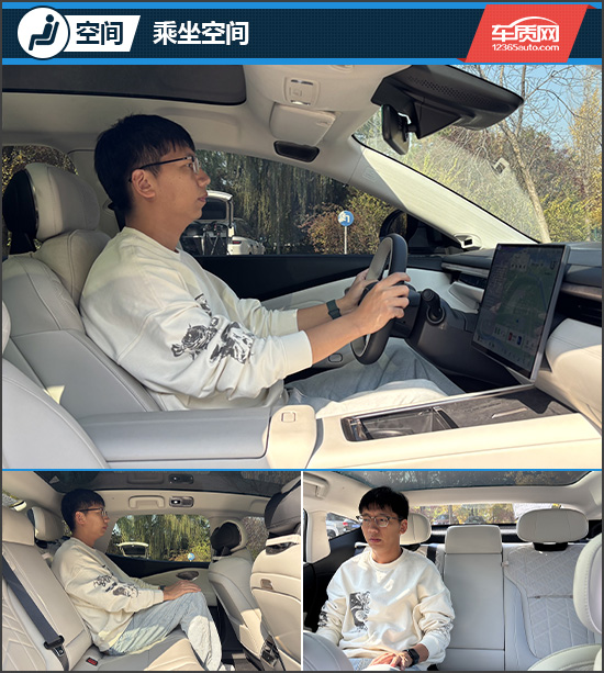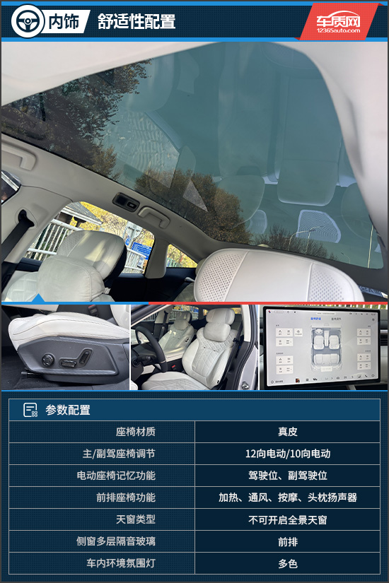 舒适配置方面,评测车配备不可开启全景天窗,虽未提供物理遮阳帘,但防晒表现出色。此外,全车配备云感零压座椅,前后排均具备电动调节功能,前排还支持通风、加热及按摩。值得一提的是,其还配备了方向盘加热功能,对寒冷地区用车十分友好。