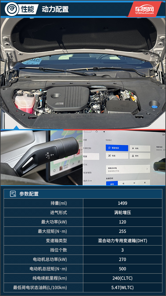 评测车基于CMA Evo架构打造,搭载由1.5T发动机与前后双电机组成的插混系统,发动机最大功率120kW,最大扭矩255N·m;电动机总功率270kW,总扭矩500N·m,CLTC纯电续航里程240km,CLTC综合续航达1400km。