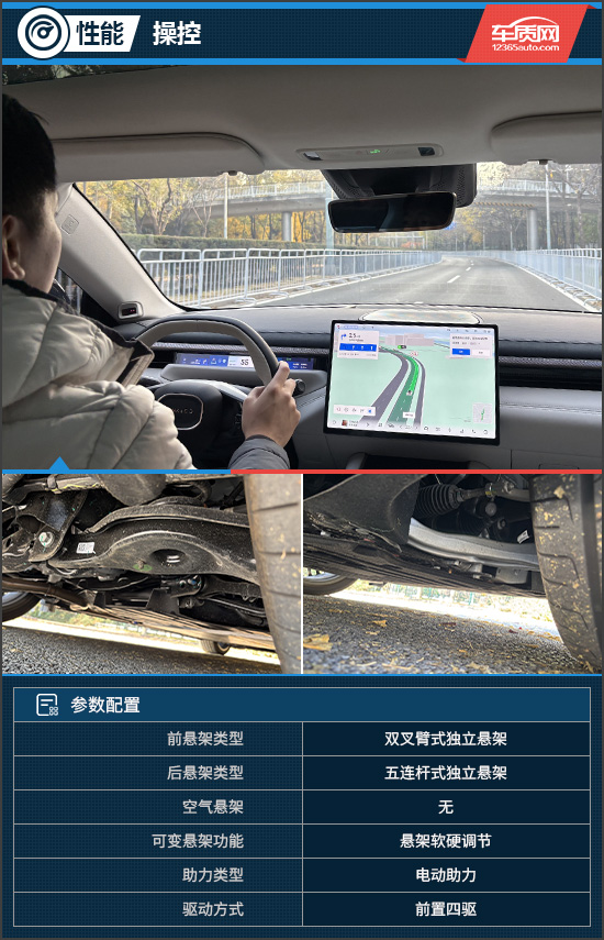 底盘方面,评测车采用前双叉臂式独立悬架与后五连杆式独立悬架的组合,为其扎实的驾控表现提供了基础。配合可变阻尼悬架系统,整体调校软硬适中,可根据不同路况灵活调整,既能高效过滤细碎震动,又能在应对大起伏时稳住车身,同时在高速过弯中提供充足支撑,舒适性与操控性达成良好平衡。此外,评测车的转向助力支持自定义调节,可满足不同驾驶偏好。车头指向精准,人车沟通感清晰直接,驾控乐趣十足。