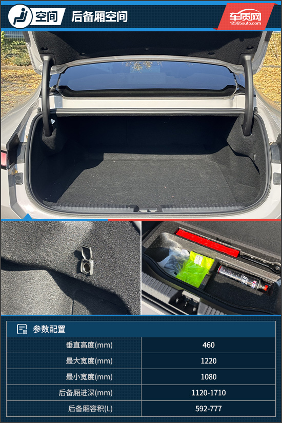 后备厢方面,其内部空间较为规整,实测常规状态下容积为592L,放倒后排座椅后可进一步拓展至777L,整体装载能力较为出色。功能性上,后备厢内设有12V电源和照明灯,进一步提升了日常使用便利性。