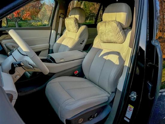 腾势N8L的“云栖座椅”做到了“每个座位都是头等舱”,从副驾到三排,舒适配置没有“减配”,座椅全部支持电动调节、加热功能,支持多种座椅情景模式。前排座椅非常宽大舒适,内部的10层填充物料偏软,头枕加入了蝶翼状造型,整体支撑和包裹都挺到位,配置上提供电动调节、通风、加热和按摩,副驾支持“零重力模式”,支持膝部、腰部双120度的身体舒适角度,功能性非常全面。