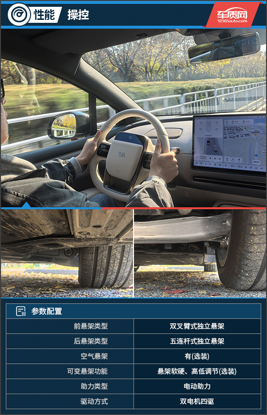 评测车配备前双叉臂式和后五连杆式独立悬架,并且选装了空气悬架功能,支持软硬、高低调节。全铝摆臂和高性能液压衬套的运用,让簧下质量更轻,振动缓冲也更细腻,既满足了驾驶者对操控乐趣的追求,又保证了车内乘员的舒适性,只要不是过于激烈的驾驶方式,车身侧倾并不明显。不过,方向盘略微存在一定虚位,急转弯的过程中需要进行适当修正。