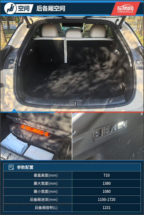 后备厢内部规整,能轻松装下5-6个登机箱;将后排座椅全部放倒后,可以获得更大的空间,便于放置大件物品。另外,后备厢左右两侧还设置有挂钩,将后备厢盖板掀起后,还有一处隐藏储物空间,非常实用。