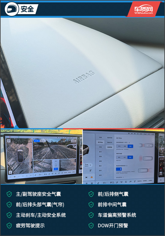 评测车采用高强度车身结构。被动安全方面,像主/副驾驶座安全气囊、前/后排侧气囊、前排中间气囊等均未缺席;主动安全方面,主动刹车/主动安全系统、车道偏离预警系统、疲劳驾驶提示等功能也一应俱全。