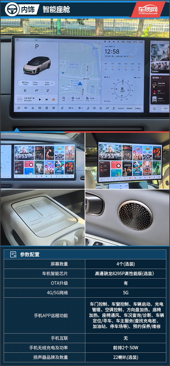 评测车配备15.7英寸中控屏,分辨率达到3K,副驾还提供了15.7英寸副驾娱乐屏,系统操作简单且响应迅速,可实现四区域语音唤醒识别,通过唤醒词“理想同学”开启互动,可控制导航、电话、空调、车窗等功能操作。由于评测车选装了后舱娱乐屏套装,所以后排装配了21.4英寸娱乐屏,车机芯片升级为高通骁龙8295P高性能版、扬声器数量也增加至22个。此外,前排中控台上方的无线充电板面积宽大,拿放手机十分方便,且充电功率都达到了50W。