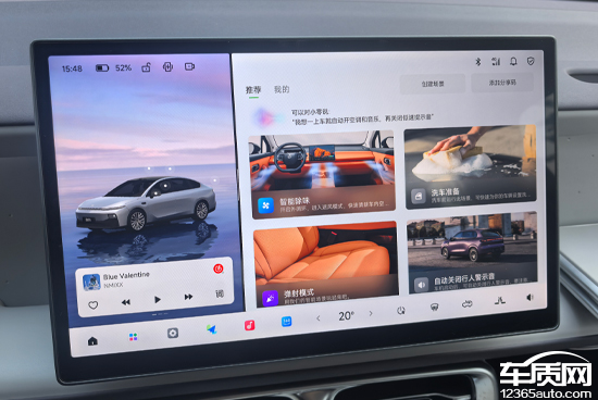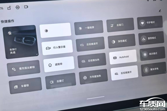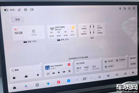 评测车的车机系统界面设计很时尚,功能区布局也比较合理。中控屏上方有门锁、手机无线充电等功能的工作状态显示,从屏幕上方向下滑动手指,可以弹出快捷操作面板。中控屏下方主要由滑动卡片区域和常用功能快捷栏组成,长按滑动卡片可以进行功能编辑,用户能根据自身喜好进行功能自定义;常用功能快捷栏涵盖车机应用、车辆设置、地图、音乐和空调等功能,大大提升操作便利程度。
