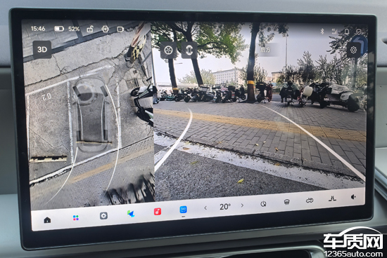 评测车配备360度全景影像、车侧盲区影像,支持多角度显示。实测来看,在白天阳光比较充足的条件下,画质清晰度也很高,畸变控制较为出色。