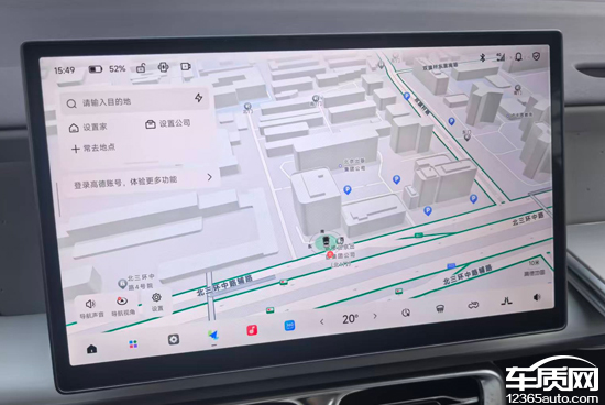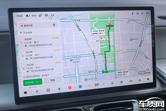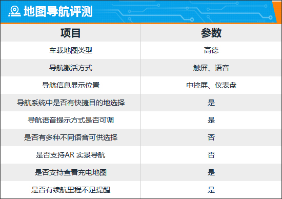 评测车自带高德导航系统,界面操控逻辑和流畅度很不错,可通过触屏、语音方式开启。地图中带有快捷目的地选项,作为一款纯电车型,其在导航界面内还支持快速查找充电站。开始导航后,导航信息会同步至仪表盘,对于驾驶者来说很实用。