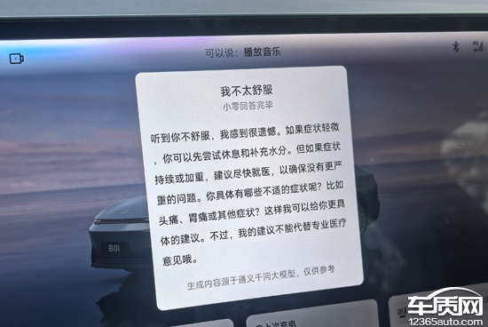 实测后发现,当说出对应指令后,除了“我不太舒服”车机通过语音大模型给出关怀问候和解决办法,其余指令系统均未做出回应。当说出“我有点饿了”,车机并未作答;说出“我有点渴了”,车机会回答“你是要去这个目的地吗”,但并未给出明确地址;说出“我有点累了”,车机会回答“当前车辆不支持该功能”。