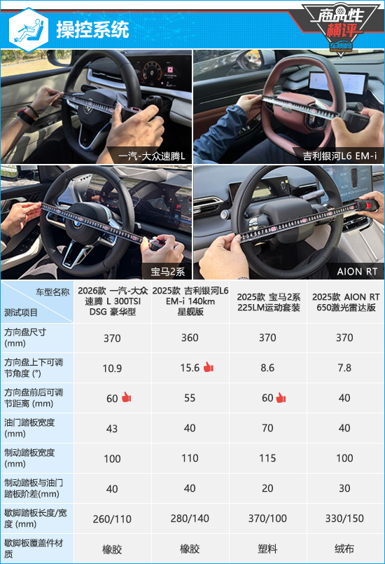 在操控系统方面,除银河L6的方向盘尺寸略小外,其余三款车的方向盘直径均为370mm,可兼顾操控稳定性和灵活性。方向盘调节方面,银河L6扳回一城,在上下可调节角度测试中处于领先。速腾L和宝马2系在方向盘前后调节距离上比较出色,均达到60mm。相比之下,AION RT的方向盘上下可调节角度和前后调节距离均排名垫底,仅为7.8°和40mm。