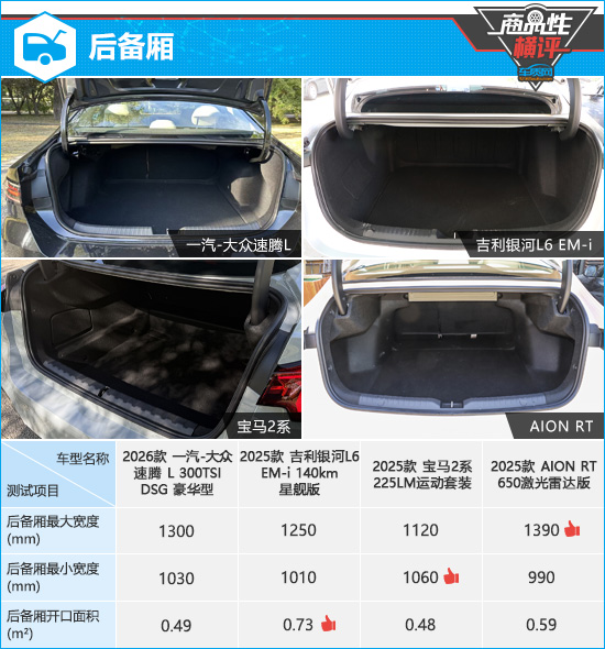 后备厢方面,AION RT和宝马2系分别在后备厢最大和最小宽度上取得领先,但后备厢开口面积最大的是银河L6,取放物品更为便捷。