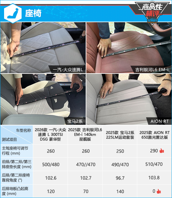 歇脚踏板方面,AION RT在长度与宽度上较为适中,整体面积最大。宝马2系虽长度占优,但宽度是四车中最窄的。相比之下,速腾L的歇脚踏板面积最小,与其他三款车型差距明显。