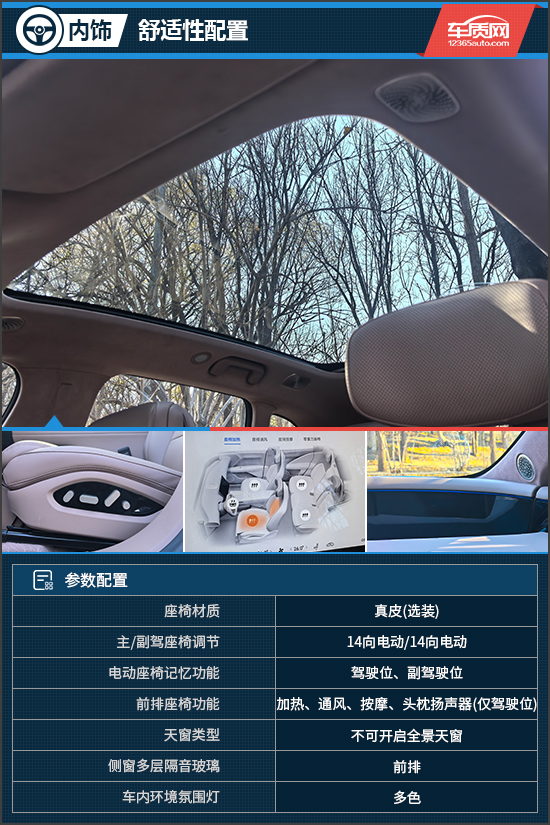 舒适性配置方面,评测车座椅乘坐质感柔软且支撑包裹到位,配合前排座椅加热、通风、按摩功能,即便长途乘坐也不会觉得疲惫。值得一提的是,驾驶位还有头枕扬声器,当其他乘客休息时驾驶员依然可以通过头枕音响以较低的音量播放音乐。评测车采用不可开启全景天窗,并带有电动遮阳帘,打开遮阳帘时可以获得一个明朗的车内环境,关闭遮阳帘后的隔热表现也可圈可点。