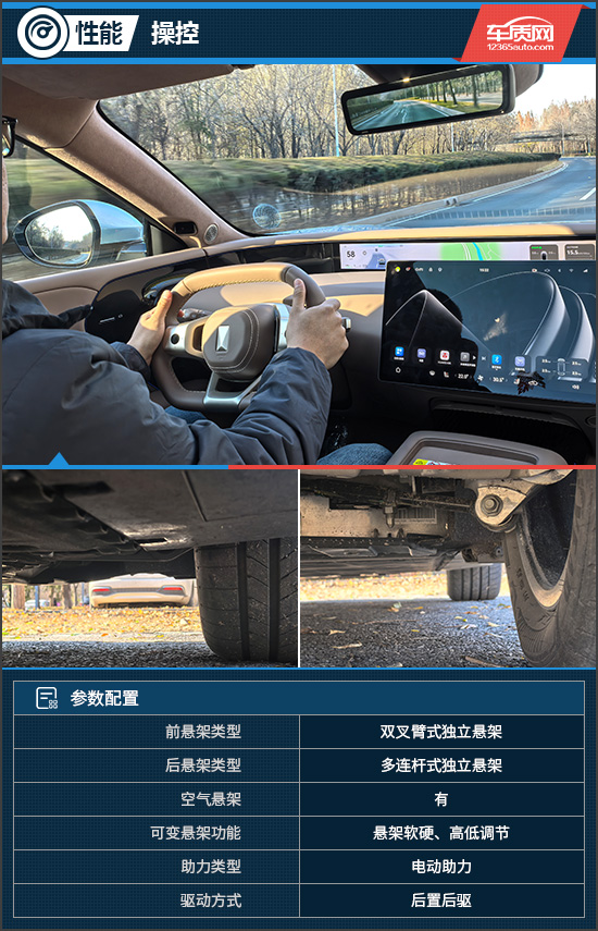 评测车配备前双叉臂式和后多连杆式独立悬架,并且配备空气悬架,支持软硬、高低调节。太行智控底盘自带智能预判功能,能根据路面情况进行实时动态调整,无惧坑洼、湿滑等场景,时刻保证车辆拥有舒适、稳定的行驶体验。操控体验上,评测车的方向盘指向性很精准,转向力度会跟随车辆速度变化,高速过弯时能够给驾驶者充足的信心。不过,由于异形方向盘的缘故,刚刚接触车辆时还需要简单适应。