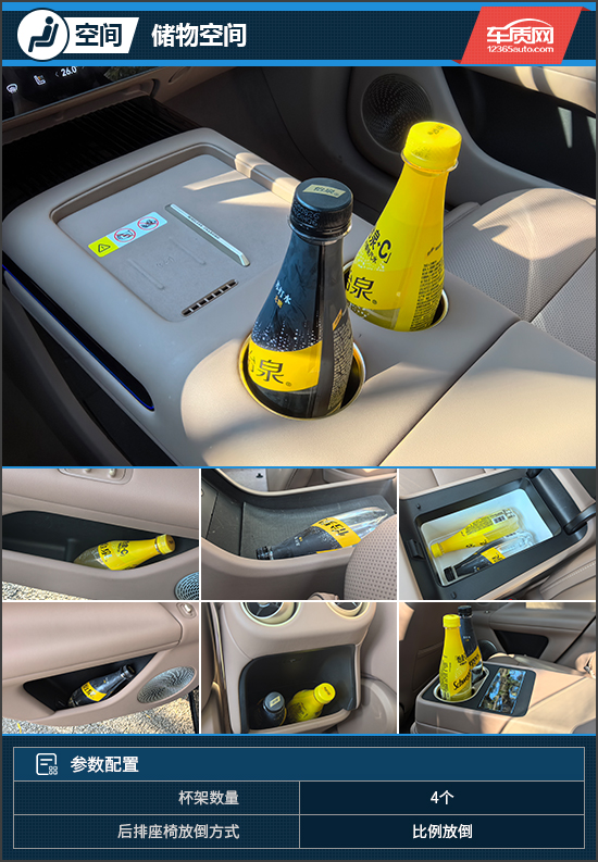 储物空间方面,评测车共有4个杯架且均有限位器,全车储物空间布局合理且容积可观。评测车还拥有智能车载冷暖箱,冬季制热、夏季制冷,方便日常出游存放食物、饮品。