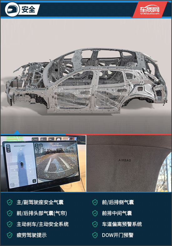 评测车采用高强度车身结构,高强度钢材与铝合金车身占比达90%。被动安全方面,像主/副驾驶座安全气囊、前/后排侧气囊、前排中间气囊等均未缺席;主动安全方面,主动刹车/主动安全系统、车道偏离预警系统、疲劳驾驶提示等功能也一应俱全。